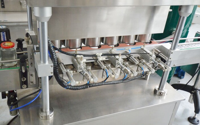 罐頭真空封蓋機用于調(diào)味品醬、水產(chǎn)罐頭、水果罐頭等采用目前環(huán)保的玻璃瓶包裝后對瓶內(nèi)真空度有比較高要求的三旋、四旋蓋的玻璃瓶進行封蓋,本機配上真空系統(tǒng)后,能先對玻璃瓶內(nèi)進行抽吸真空,然后再進行旋蓋封口,以延長瓶內(nèi)容物的保質(zhì)期及增強口感,而且不用加熱以保持物料色澤不變。實行自動進瓶、自動封蓋、自動進行抽真空。